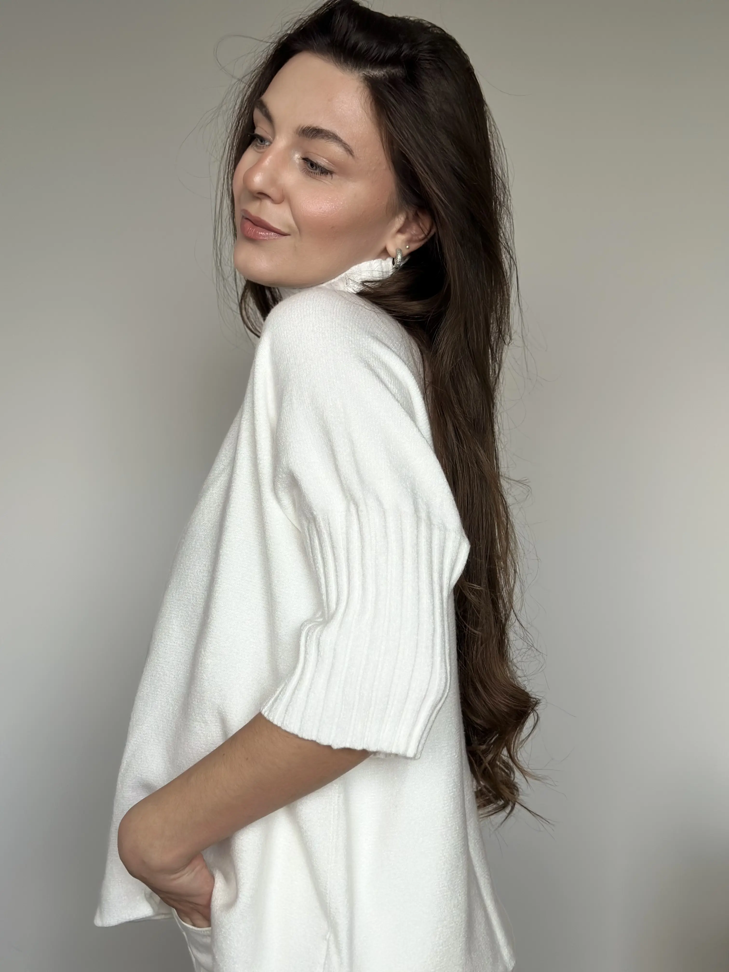 This oversized pullover features a straight cut and 3/4 sleeves, offering a casual and contemporary look. Its roomy fit accommodates sizes up to 48/50, ensuring comfort and freedom of movement. Made from soft material, it’s perfect for versatile everyday wear.