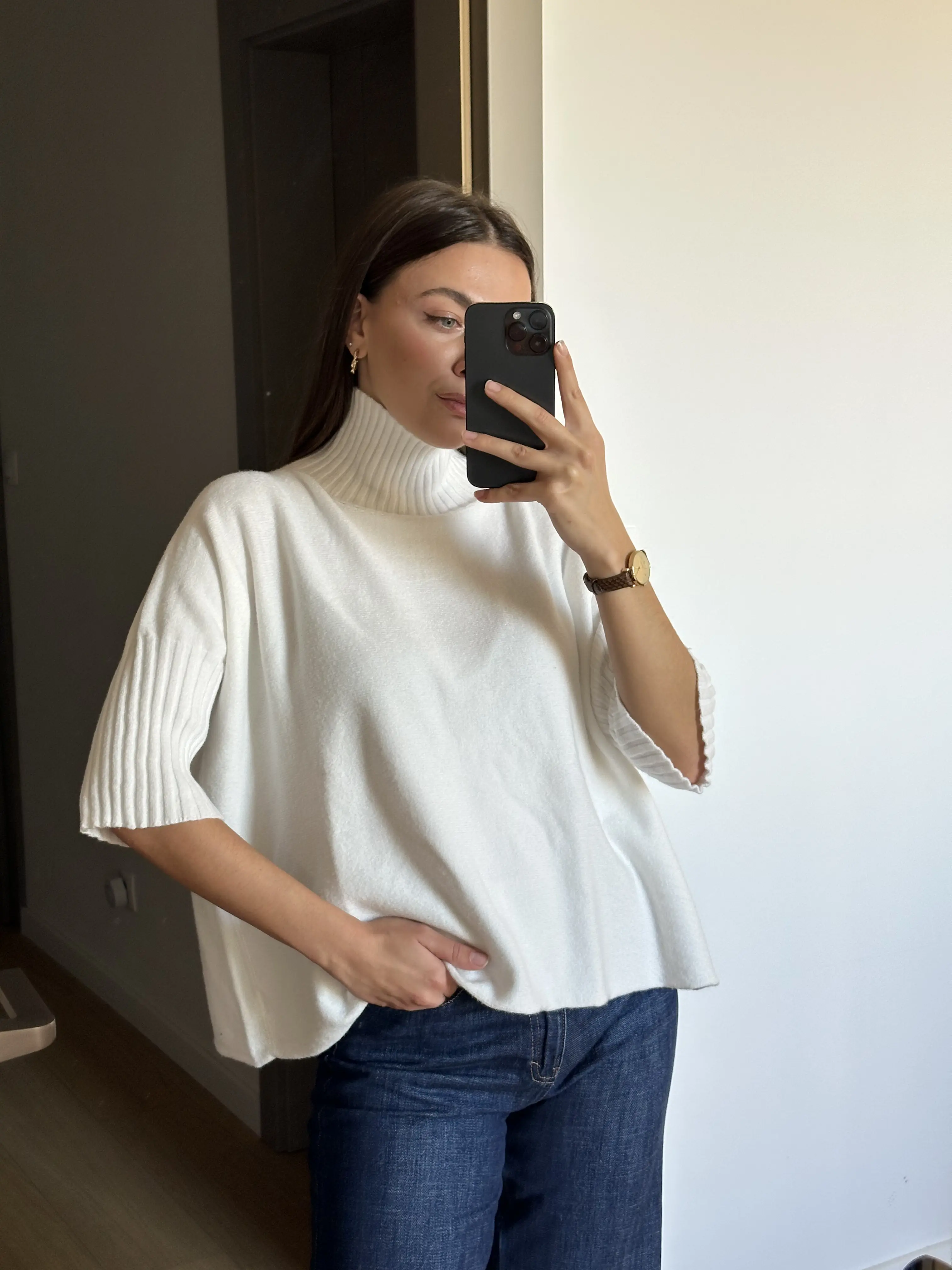 Oversized knit sweater with a straight cut and 3/4 sleeves.