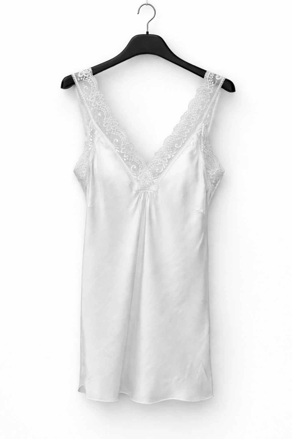 An elegant and refined satin top, featuring a deep V-neckline enhanced with delicate lace details. The fluid fit makes it comfortable and versatile, perfect to wear under a blazer for a sophisticated look or on its own for a more sensual and chic style.
